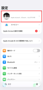 iPhoneの「設定」アプリを開き、アップルアカウントをタップします。