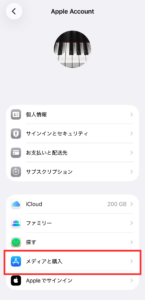 アップルアカウントを開いて下にスクロールし「メディアと購入」を選択します。