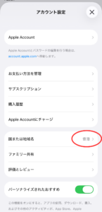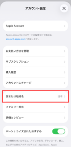 アカウント設定情報が表示されます。画面をスクロールし、「国または地域名」をタップしてください。